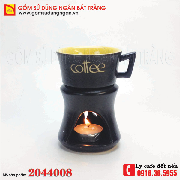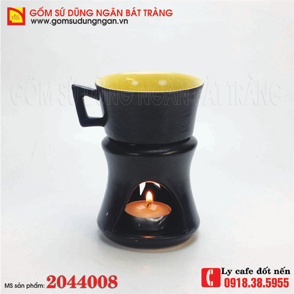 Ly cà phê đốt nến kiểu dáng cốc tai nhọn gốm men đen lòng vàng khắc chữ Coffee, gốm sứ Bát Tràng cao cấp. Ly cafe đốt nến còn có tên gọi là Ly cafe nóng, bếp đun cafe, bếp cafe đốt nến do khi sử dụng thắp một ngọn nến bên dưới ly sứ làm nóng cafe ở bên trên, tăng độ ngậy độ thơm và tạo phong cách uống cafe mới. Sản phẩm được cung cấp bởi Gốm sứ Dũng Ngân Bát Tràng.