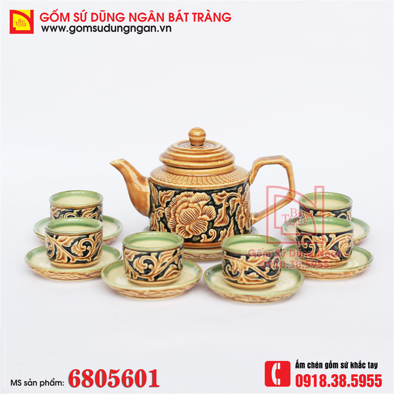 Ấm chén Bát Tràng khắc hoa phù dung Gốm sứ Dũng Ngân