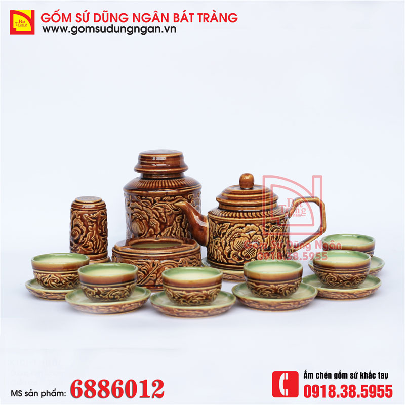 Bộ ấm trà Bát Tràng khắc hoa phù dung Gốm sứ Dũng Ngân