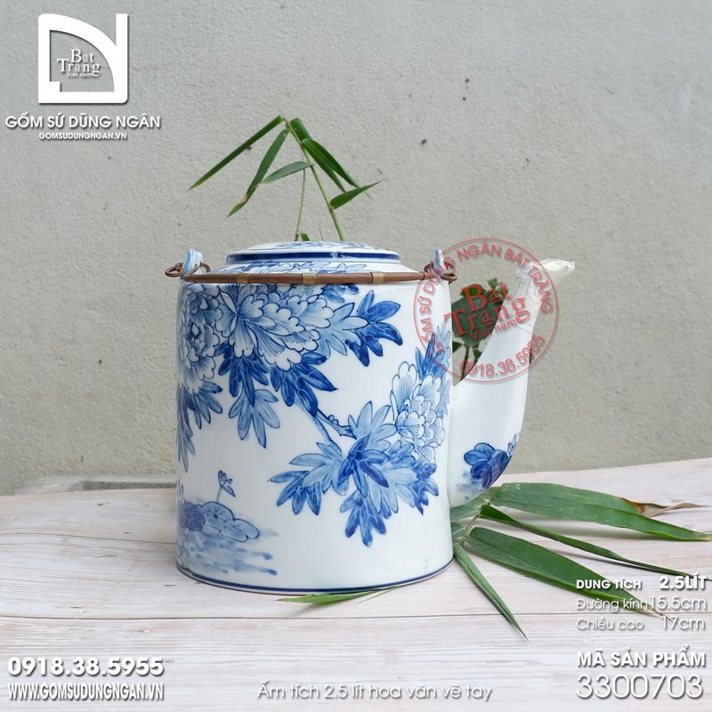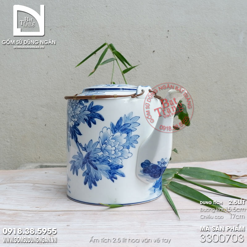 Ấm tích Bát Tràng dung tích 2.5 lít men lam cổ vẽ chim tre gốm sứ Bát Tràng cao cấp. Ấm tích trà xanh đẹp, họa tiết hoa văn 100% được vẽ thủ công, quai ấm bằng đồng đặc nguyên chất. Sản phẩm có nguồn gốc xuất xứ Bát Tràng và được cung cấp bởi Gốm sứ Dũng Ngân Bát Tràng.