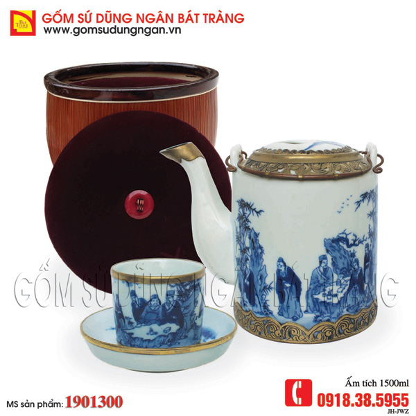 Bộ ấm tích men lam cổ bọc đồng gốm sứ Bát Tràng cao cấp vẽ tích cổ Trúc Lâm Thất Hiền kèm theo bao ấm ủ bọc vải Nhung màu Booc-đô. Dung tích ấm tích 1500ml. Bộ sản phẩm bao gồm 1 giỏ ủ ấm tích đẹp, 1 ấm tích, 6 cốc uống trà và 6 đĩa kê chén.