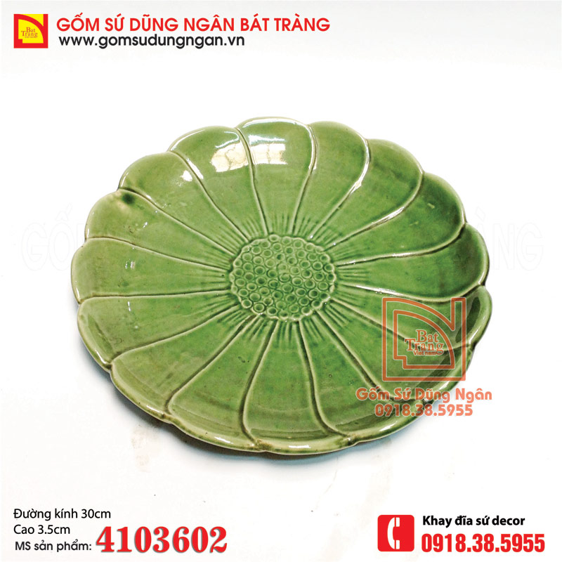 Đĩa sứ Bát Tràng cao cấp men xanh đồng dòng đĩa sứ decor hoa cúc thuộc bộ đồ ăn gốm sứ decor. Đĩa sứ đẹp, đường kính đĩa sứ 30cm, nguồn gốc xuất xứ Bát Tràng. Sản phẩm được cung cấp và chuyển phát Cod Toàn Quốc bởi Gốm sứ Dũng Ngân Bát Tràng.