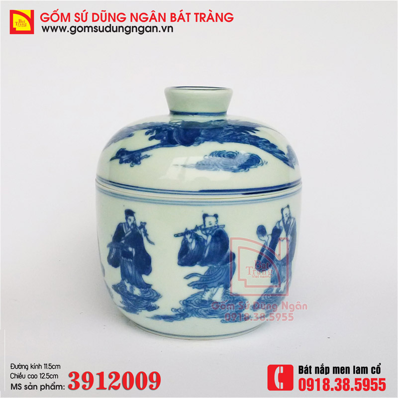Bát nắp men lam cổ vẽ tích cổ Bát Tiên - Sản phẩm phục chế theo mẫu cổ vật Cung Đình Huế, Đồ Nội Phủ, Đồ Ký Kiểu phục chế gốm sứ Bát Tràng cao cấp. Bát sứ đẹp, họa tiết hoa văn với màu sắc tươi tắn, gần giống với phiên bản cũ. Sản phẩm có nguồn gốc xuất xứ Bát Tràng và được cung cấp bởi Gốm sứ Dũng Ngân Bát Tràng.