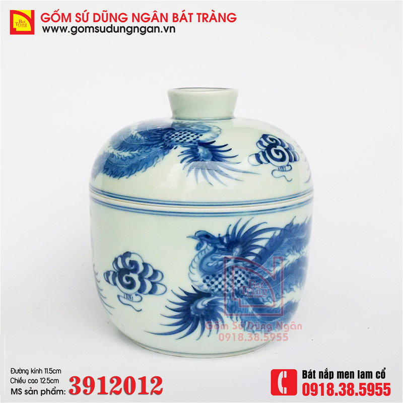 Bát nắp men lam cổ vẽ chim Phượng gốm sứ Dũng Ngân Bát Tràng