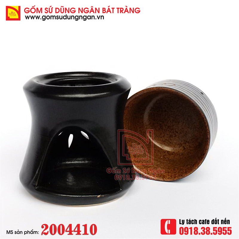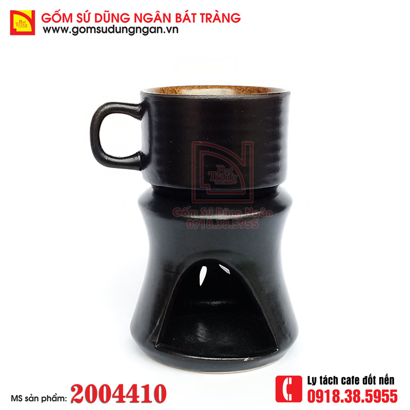 Ly tách cà phê đốt nến men đen lòng gốm Gốm sứ Bát Tràng cao cấp. Ly tách cafe nóng đẹp với màu sắc đen và gốm. Men đen được phủ bên ngoài, thân cốc khắc chữ Coffee, lòng cốc tráng men gốm (màu nâu cà phê). Bộ sản phẩm gồm 1 ly sứ và 1 bếp sứ. Sản phẩm có nguồn gốc xuất xứ Bát Tràng và được cung cấp bởi Gốm sứ Dũng Ngân Bát Tràng.
