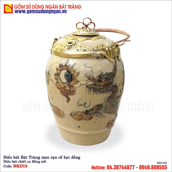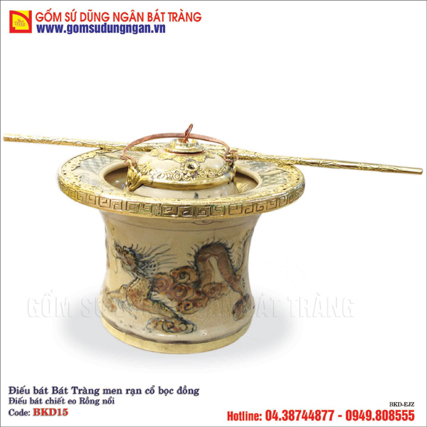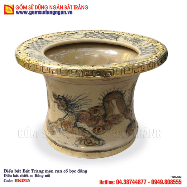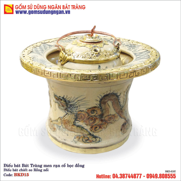 Điếu bát Bát Tràng men rạn cổ bọc đồng cao cấp với họa tiết Rồng đắp nổi nổi bật trên nền men rạn truyền thống của Đồ gốm sứ Bát Tràng. Mỗi bộ điếu bát bọc đồng kèm theo 1 se điếu bằng đồng.